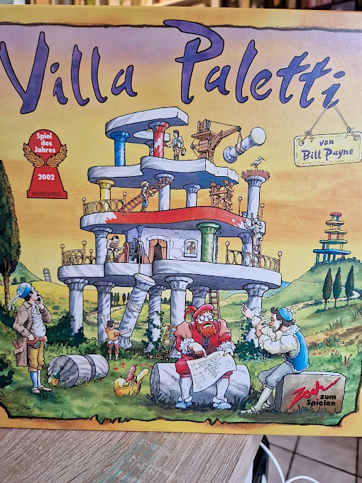 Im Land wo Zitronen blühen, lebte einst ein lustiger junger Bursche, den seine Freunde schlicht "Paletti" nannten. Der hatte nur eins im Kopft: das prächtige Luftschloss fertig zu bauen, das sein etwas schrulliger Großvater einst begonnen, aber mangels Dukaten nie vollendet hatte. Dukaten hatte Paletti zwar auch keine, dafür aber einen genialen Plan: Wazu neue Säulen kaufen, wo doch in den unteren Etagen so viele nutzlos rumstehen?! Die werden ausgebaut, höher gestellt und ganz oben wieder eingebaut" "Excellente, Paletti" riefen seine Freunde und machten sich ans Werk. So entstand ein waghalsiger Prachtbau: die Villa Paletti.