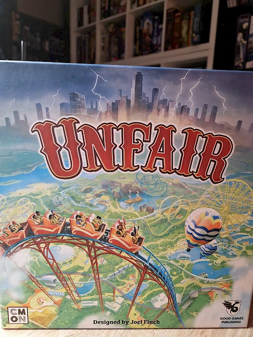 Unfair ist ein Freizeitpark-Aufbauspiel von Joel Finch für 2 bis 5 Personen, bei dem du beeindruckend hohe Attraktionen errichtest und aufwertest, geheime Ziele auf deinen Blaupausen verwirklichst und versuchst, das meiste Geld zu verdienen.