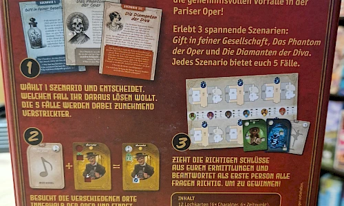 Erlebt 3 spannende Szenarien: Gift in der feinen Gesellschaft, Das Phantom der Oper und Die Diamanten der Diva. Jedes Szenarion bietet euch 5 Fälle.