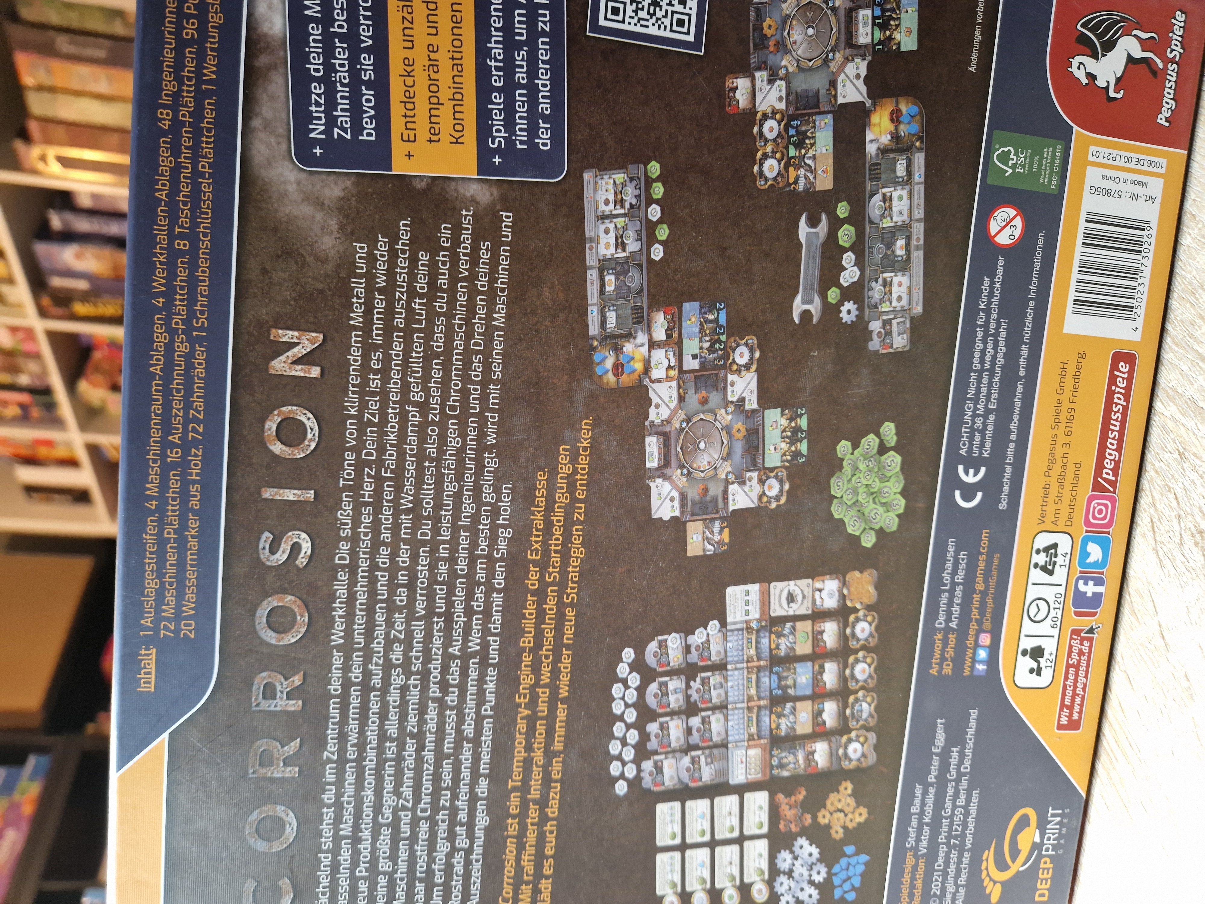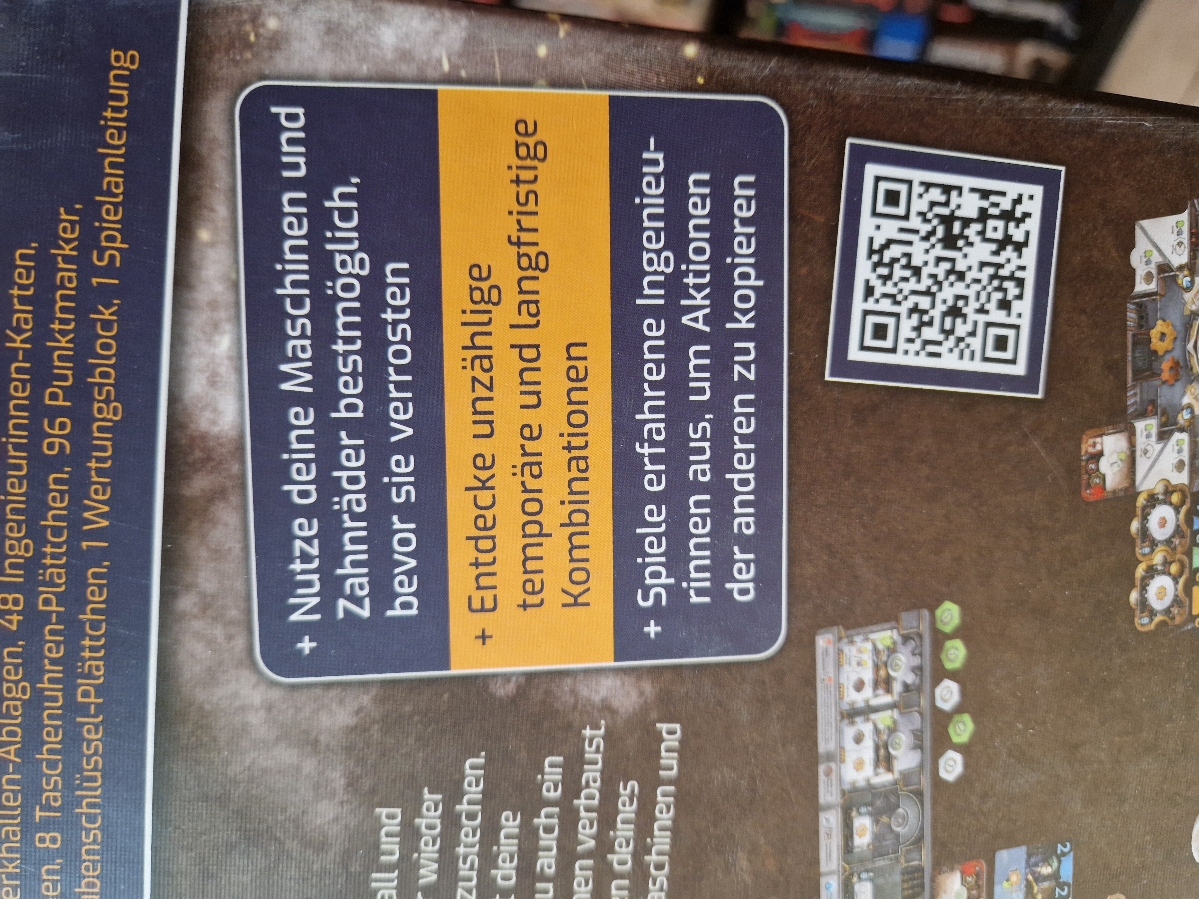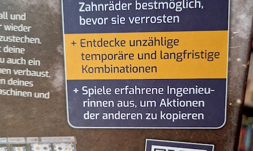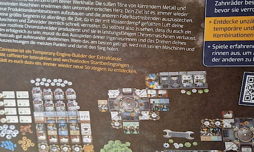 Lächelnd stehst Du im Zentrum deiner Werkhalle: Die süßen Töne von klirrendem Metall und rasselnden Maschinen erwärmen dein unternehmerisches Herz. Dein Ziel ist es, immer wieder neue Produktionskombinationen aufzubauen und die anderen Fabrikbetreibenden auszustechen. Deine größte Gegnerin ist allerdings die Zeit, da in der mit Wasserdampf gefüllten Luft deine Maschinen und Zahnräder ziemlich schnell verrostesn. Du solltest also zusehen, dass du auch ein paar rostfreie Chromzahnräder produzierst und sie in leistungsfäghigen Chrommaschinen verbaust. Um erfolgreich zu sein, musst du das Ausspielen deiner Ingenieurinnen und das Drehen deines Rostrads gut aufeinander abstimmen. Wem das am bestene gelingt, wird mit seinen Maschinen und Auszeichnungen die meisten Punkte uns damit den Sieg holen.