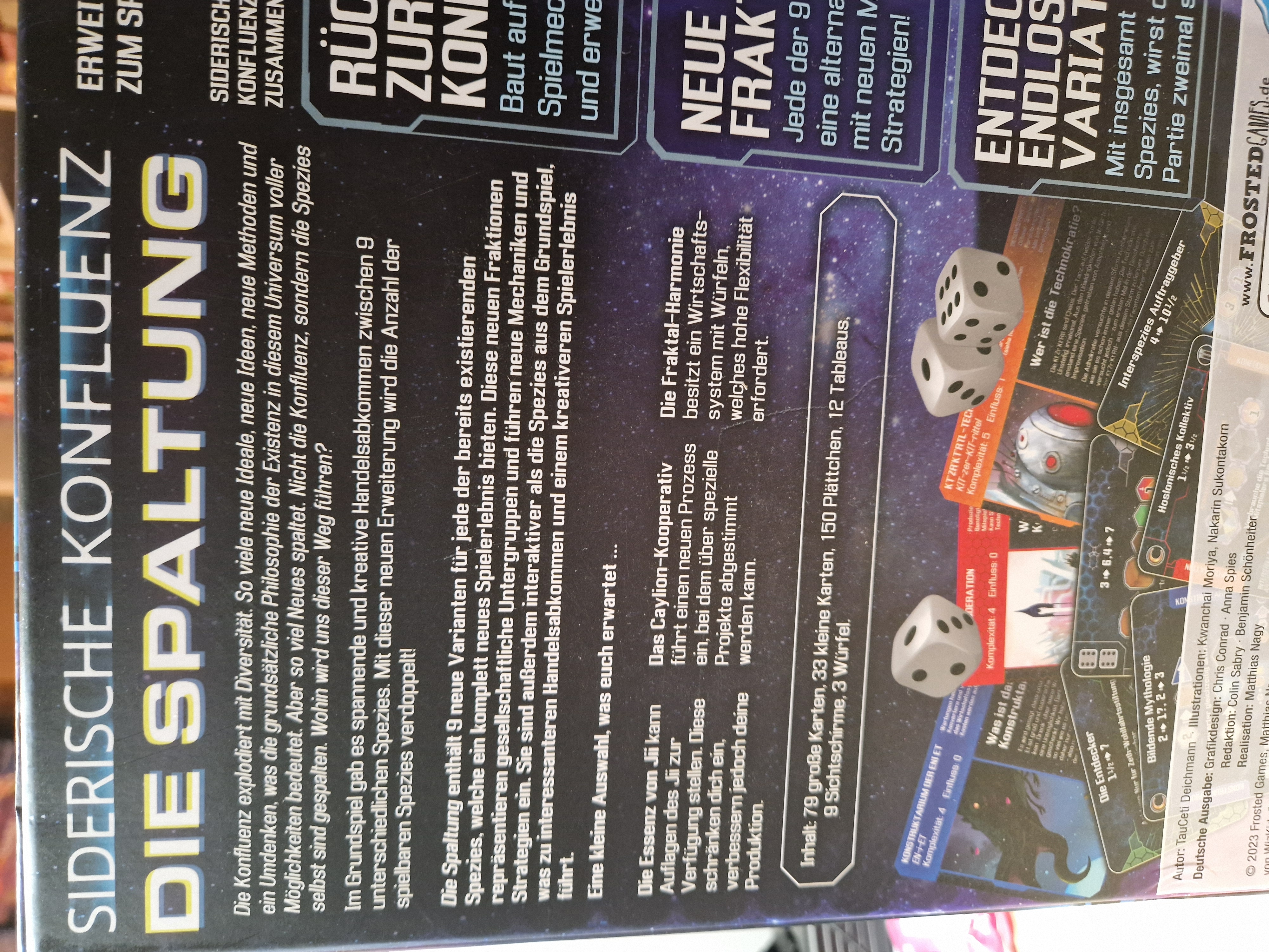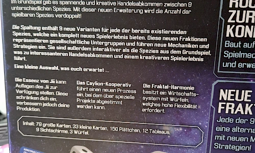 Im Grundspiel gab es spannende und kreative Handelsabkommen zwischen 9 unterschiedlichen Spezies. Mit dieser neuen Erweiterung wir die Anzahl der spielbaren Spezies verdoppelt! Die Spaltung enthält 9 neue Varianten für jede bereits existierenden Spezies, welche ein komplett neues Spielerlebnis bieten. Diese neuen Fraktionen repräsentieren gesellschaftliche Untergruppen und führen neue Mechaniken und Strategien ein. Sie sind außerdem interaktiver als die Spezies aus dem Grundspiel, was zu interessanteren Handelsabkommen und einem kreativeren Spielerlebnis führt.