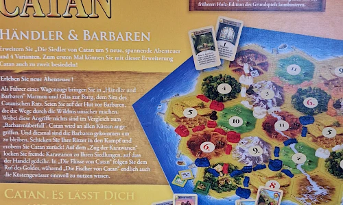 Als Führer eines Wagenzugs bringen sie in "Händler & Barbaren" Marmor und Glas zur Burg, dem Sitz des Catanischen Rats. Seien sie auf der Hut vor Barbaren, die die Wege durch die Wildnis unsicher machen. Wobei diese Angriffe nichts sind im Vergleich zum "Barbarenüberfall". Catan wird an allen Küsten angegriffen. Und diesmal sind die Barbaren gekommen um zu bleiben. Schicken sie ihre Ritter in den Kampf und erobern sie Catan zurück! Auf dem "Zug der Karawanen" locken sie fremde Karawanen zu ihren Siedlungen, auf dass der Handel gedeihe. In "Die Flüsse von Catan" folgen sie dem Ruf des Goldes, während "Die Fischer von Catan" endlich auch die Küstengewässer sinnvoll zu nutzen wissen.