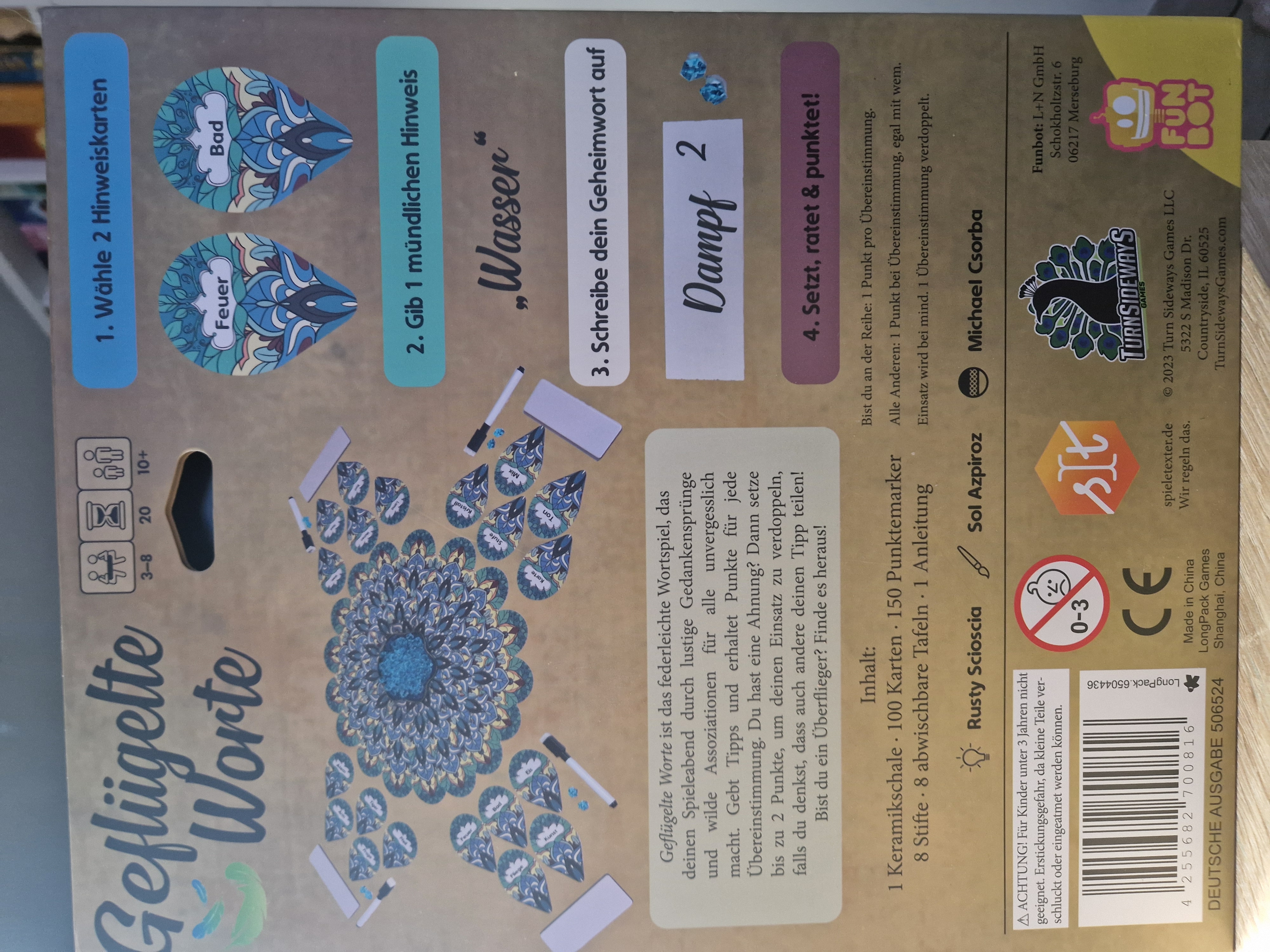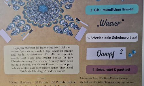 Geflügelte Worte ist das federleichte Wortspiel, das deinen Spieleabend durch lustige Gedankensprünge und wilde Asaasoziationen für alle unvergesslich macht. Gebt Tipps und erhaltet Punkte für jede Übereinstimmung. Du hast eine Ahnung? Dann setze bis zu 2 Punkte, um deinen Einsatz zu verdoppeln, falls du denkst, dass auch andere deinen Tipp teilen!
