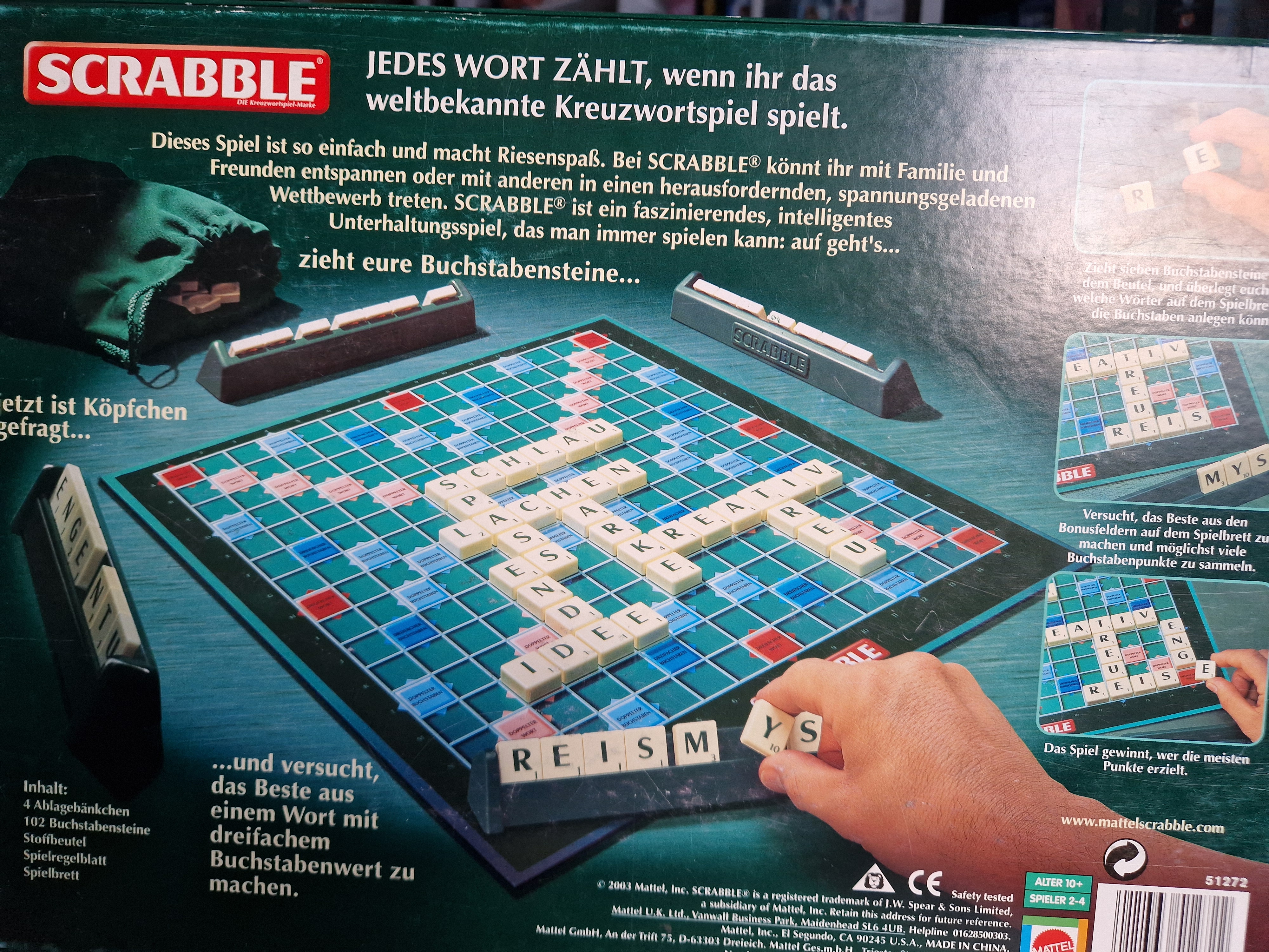 Dieses Spiel ist so einfach und macht Riesenspaß. Bei Scrabble könnt ihr mit Familie und Freunden entspannen oder mit anderen in einen herausfordernden, spannungsgeladenen Wettbewerb treten. Scrabble ist ein fazinierendes, intelligentes Unterhaltungspiel, das man immer spielen kann: auf geht`s....