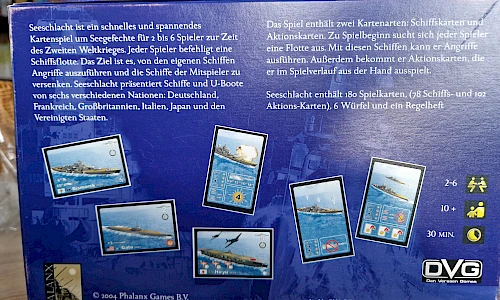 Seeschlacht ist ein schnelles und spannendes Kartenspiel um Seegefechte zur Zeit des Zweiten Weltkrieges. Jeder Spieler befehligt eine Schiffsflotte. Das Ziel ist es, von den eigenen Schiffen Angriffe auszuführen und die Sschiffe der Mitspieler zu versenken. Seeschlacht präsentiert Schiffe und U-Boote von sechs verschiedenen Nationen: Deutschland, Frankreich, Großbritannien, Italien, Japan und den Vereinigten Staaten.
