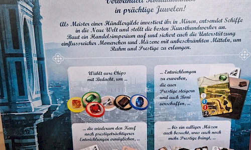 Wählt eure Chips mit Bedacht, um Entwicklungen zu erwerben, die euer Prestige steigern und euch Boni verschaffen, die wiederum den Kauf noch prestigeträchtigerer Entwicklungen ermöglichen, bis ein adliger Mäzen euch besucht, was euch noch mehr Prestige bringt, denn nur Prestige zählt für den Sieg!