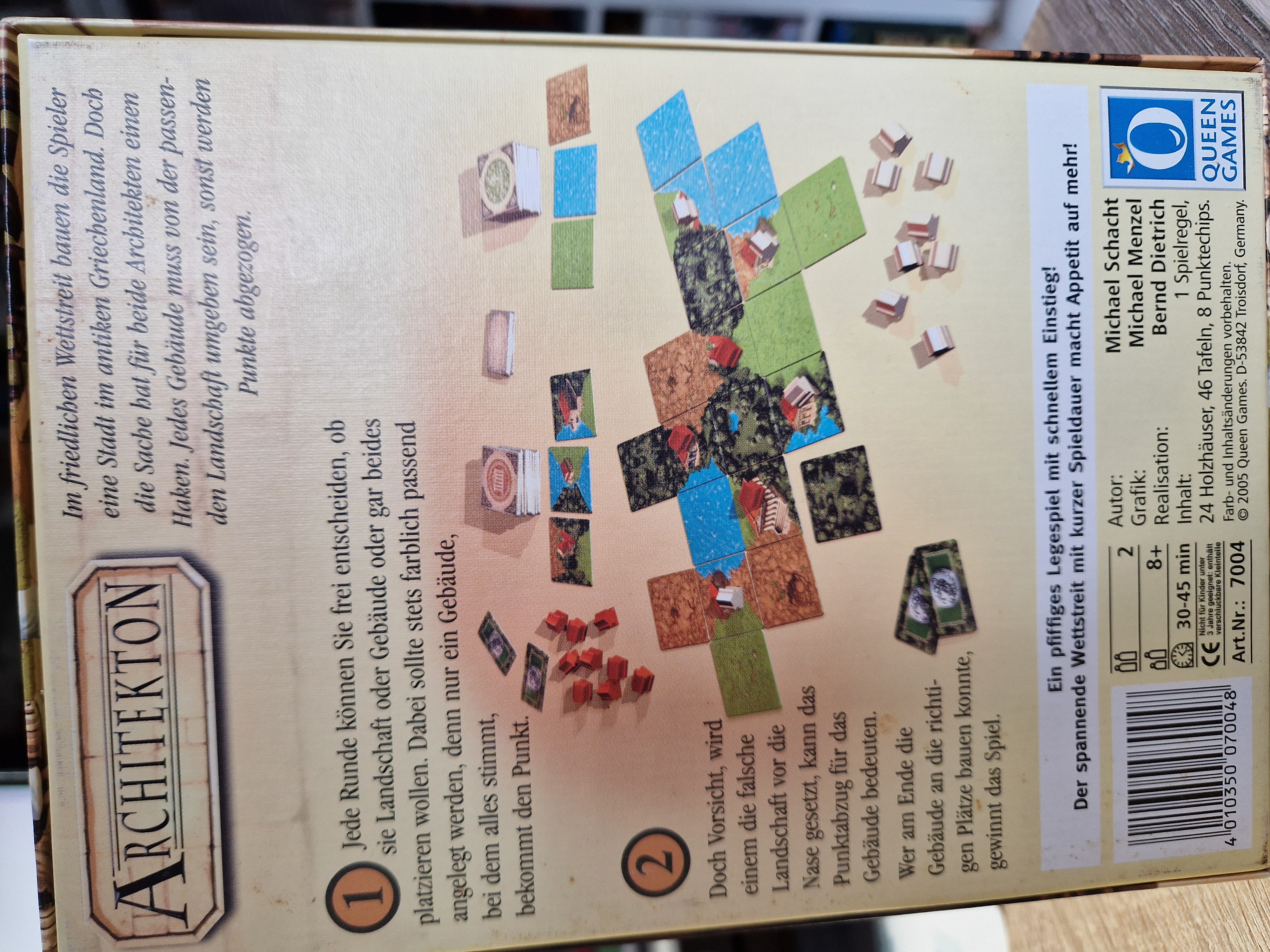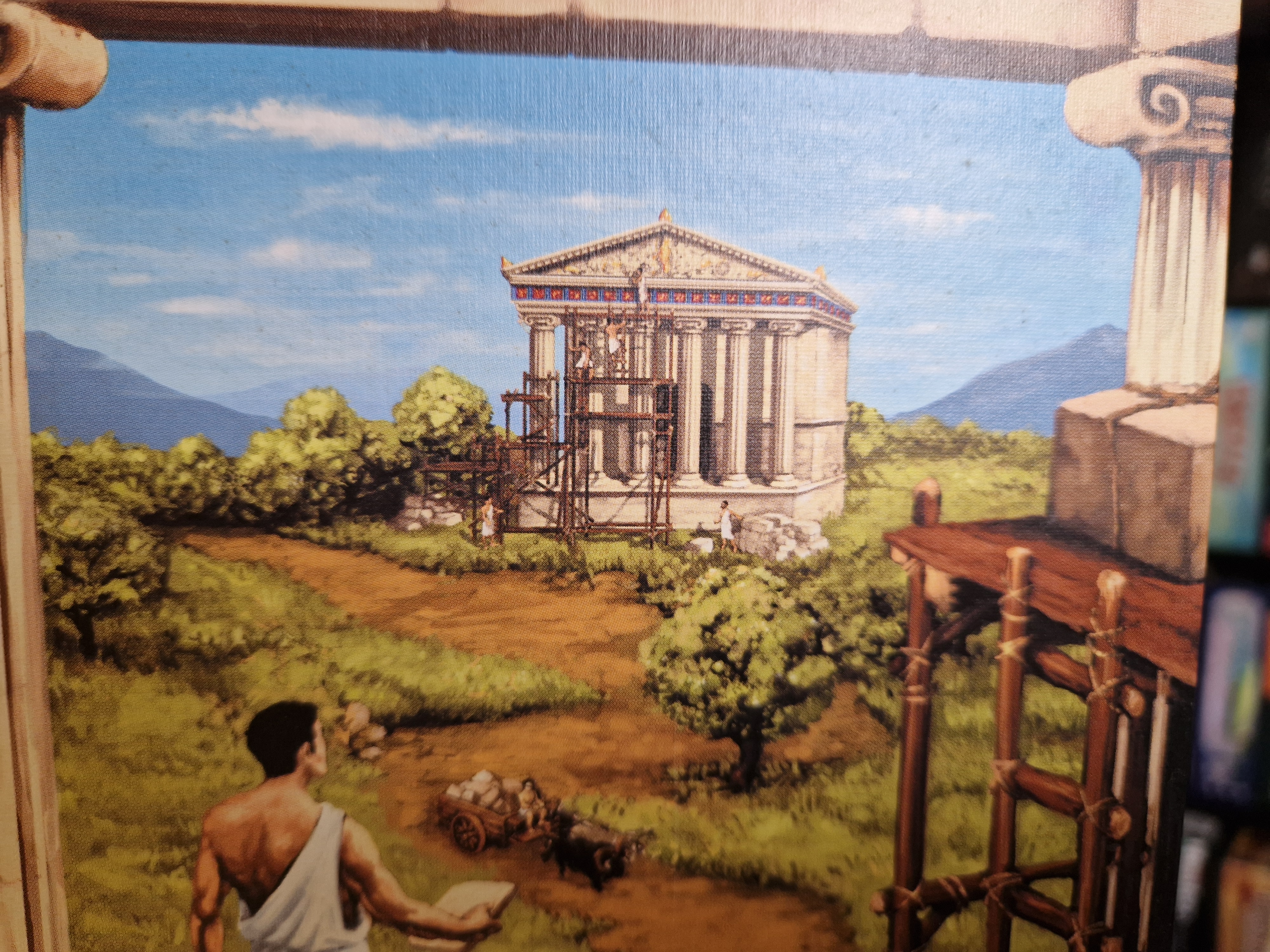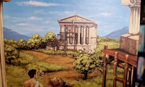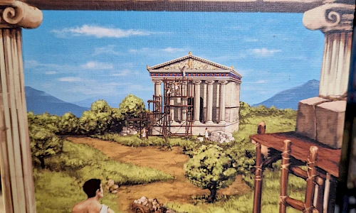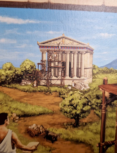 Im friedlichen Wettstreit bauen die Spieler eine Stadt im antiken Griechenland. Doch die Sache hat für beide Architekten einen Haken. Jedes Gebäude muss von der passenden Landschaft umgeben sein, sonst werden Punkte abgezogen.