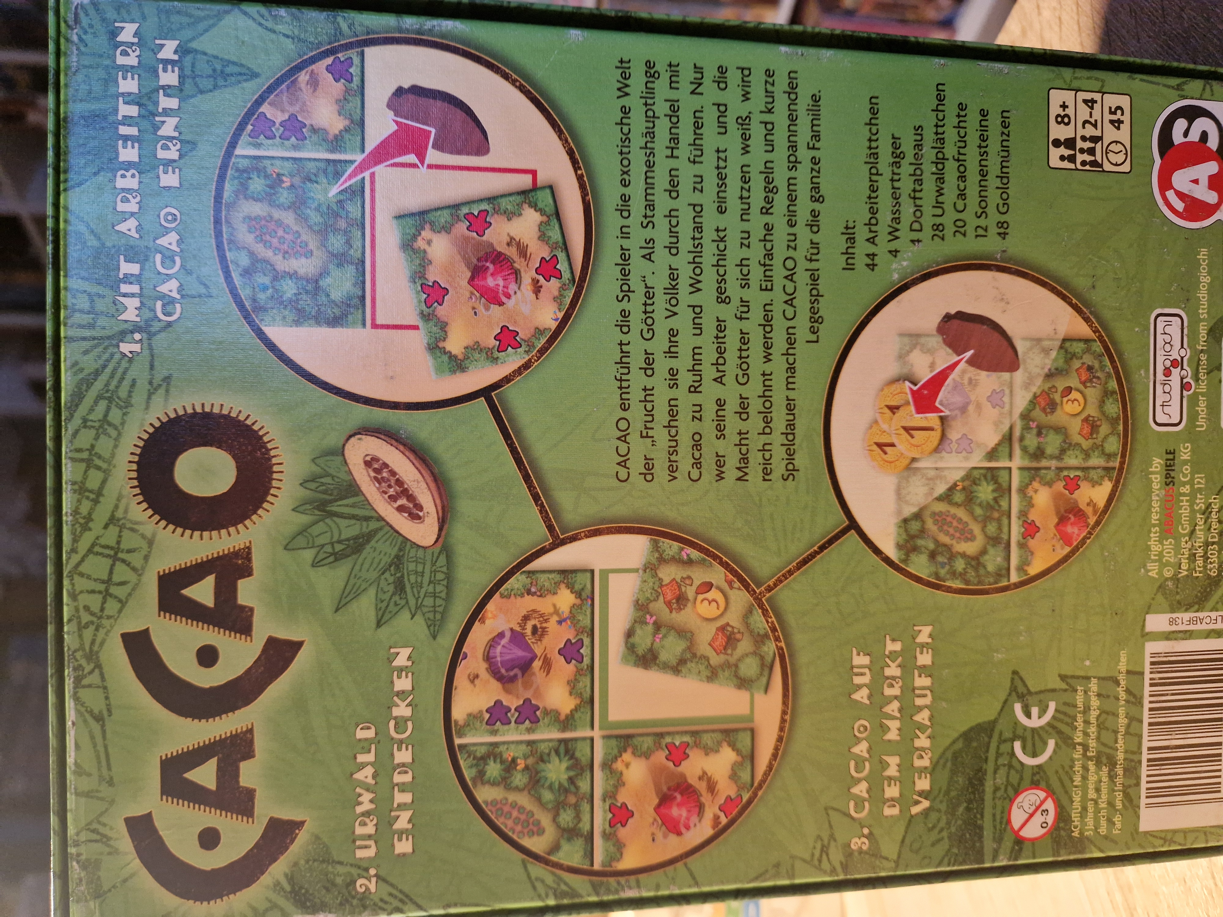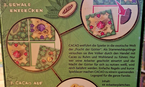 Cacao enführt die Spieler in die exotische Welt der "Frucht der Götter". Als Stammeshäuptlinge versuchen sie ihre Völker durch den Handel mit Cacao zu Ruhm und Wohlstand zu führen. Nur wer seine Arbeiter geschickt einsetzt und die Macht der Götter für sich zu nutzen weiß, wird reich belohnt werden. Einfache Regeln und kurze Spieldauer machen Cacao zu einem spannenden Legespiel für die ganze Familie.