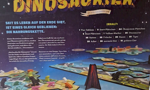 Auf spielerische Art erlebt ihr ein uraltes Prinzip. Dabei erschafft ihr ein wachsendes Ökosystem mit gerade genug von jeder Lebensform, um Dinosaurier die Welt beherschen zu lassen. Ressourcen sind knapp, Tiere können aussterben, und zum Überleben müssen alle etwas fressen. Plant vorausschauend - es geht um Leben und Tod...
