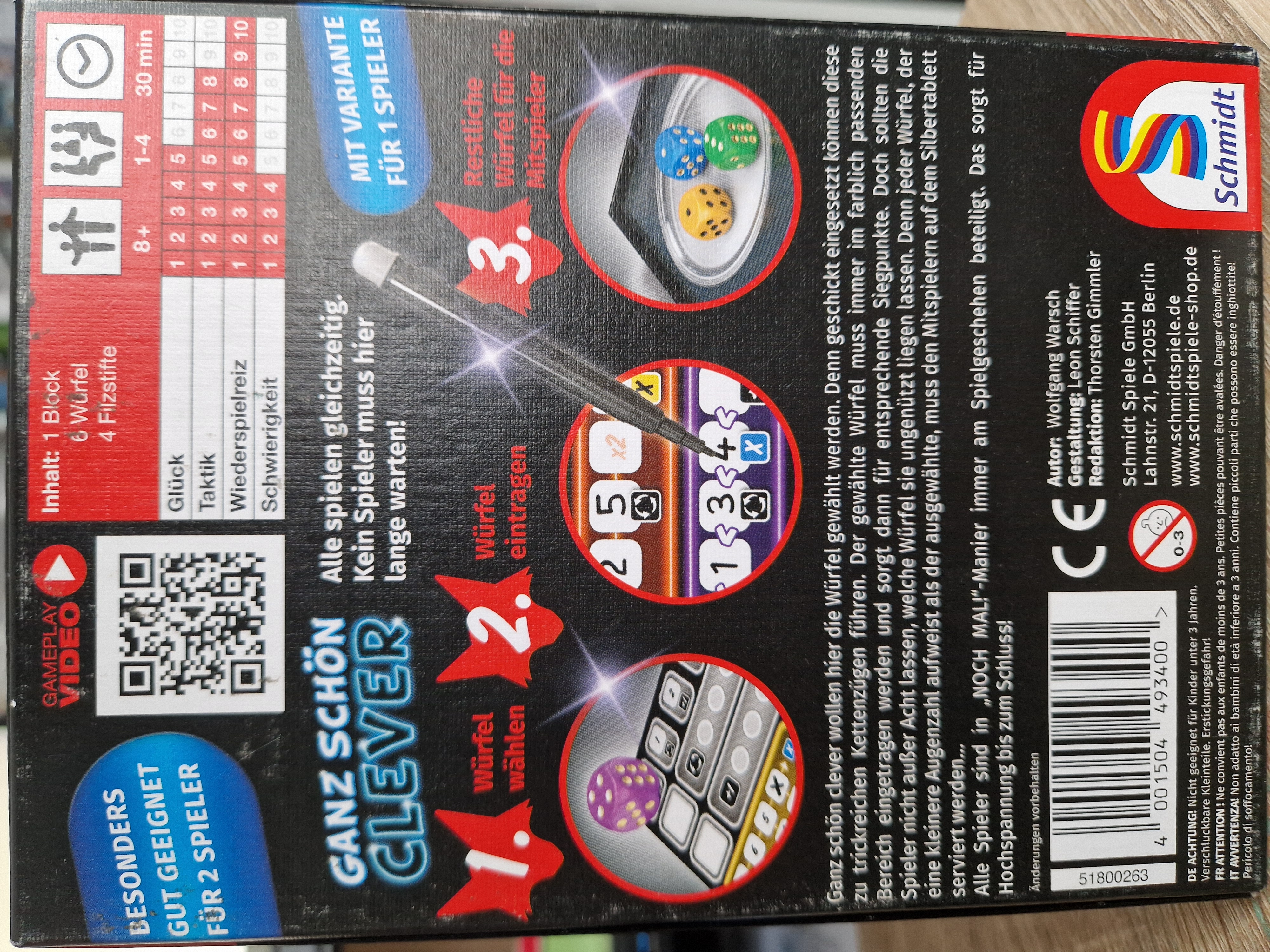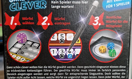 Ganz schön clever wollen hier die Würfel gewählt werden. Denn geschickt eingesetzt können diese zu trickreichen Kettenzügen führen. Der gewählte Würfel muss immer im farblich passenden Bereich eingetragen werden und sorgt dann für entsprechende Siegpunkte. Doch sollten die Spieler nicht außer Acht lassen, welche Würfel sie ungenützt liegen lassen. Denn jeder Würfel, der eine kleinere Augenzahl aufweist als der ausgewählte, muss den Mitspielern auf dem Silbertablett serviert werden...