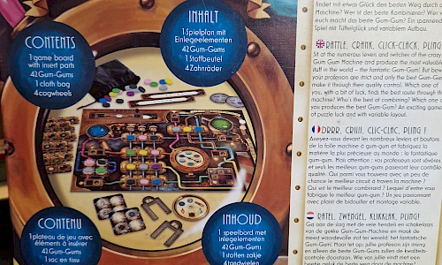 Setzt euch an die Hebel und Schalter der verrückten Gum-Gum-Maschine und stellt den wertvollsten Stoff der Welt her -das fantastische Gum-Gum! Doch Achtung: Eure Professoren sind streng und nur die besten Gum-Gums schaffen es durch ihre Qualitätskontrolle. Wer von euch findet mit etwas Glück den besten Weg durch die Maschine? Wer ist der beste Kombinierer? Wer von euch macht das beste Gum-Gum? Ein spannendes Spiel mit Tüftelglück und variablem Aufbau.