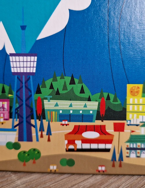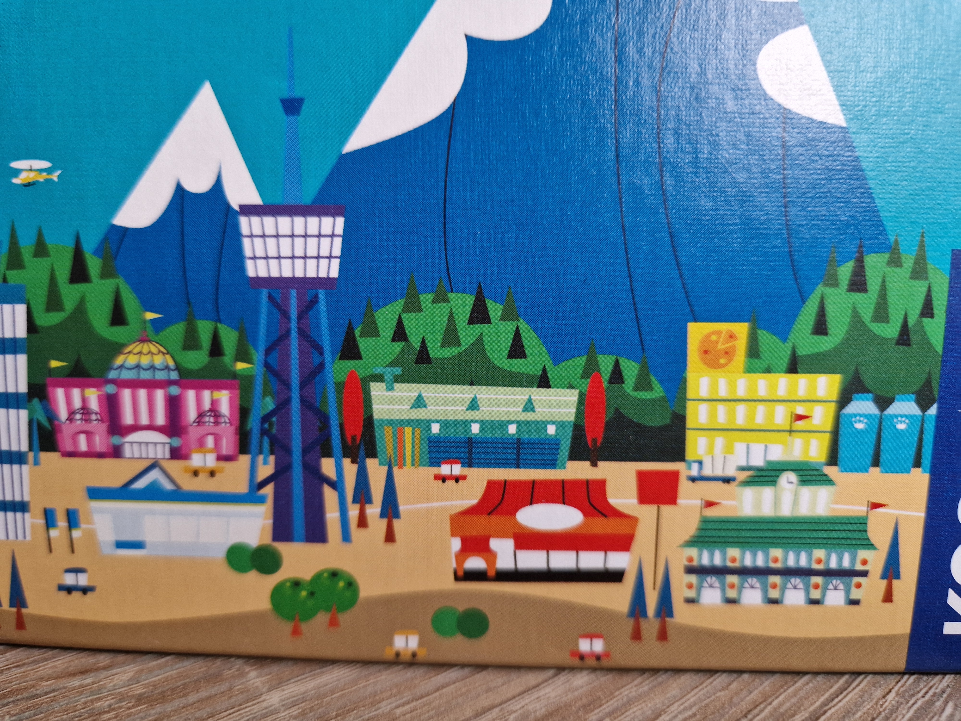 Mit Würfeln und Krten erbaut hier jeder seine eigene kleine Stadt. Willst du lieber erst viele kleine Bauvorhaben verwirklichen oder gleich ein Großprojekt in Angriff nehmen? Der Bahnhof muss gebaut werden ... und der Funkturm ... Je mehr du baust, dest höher ist dein Einkommen.
