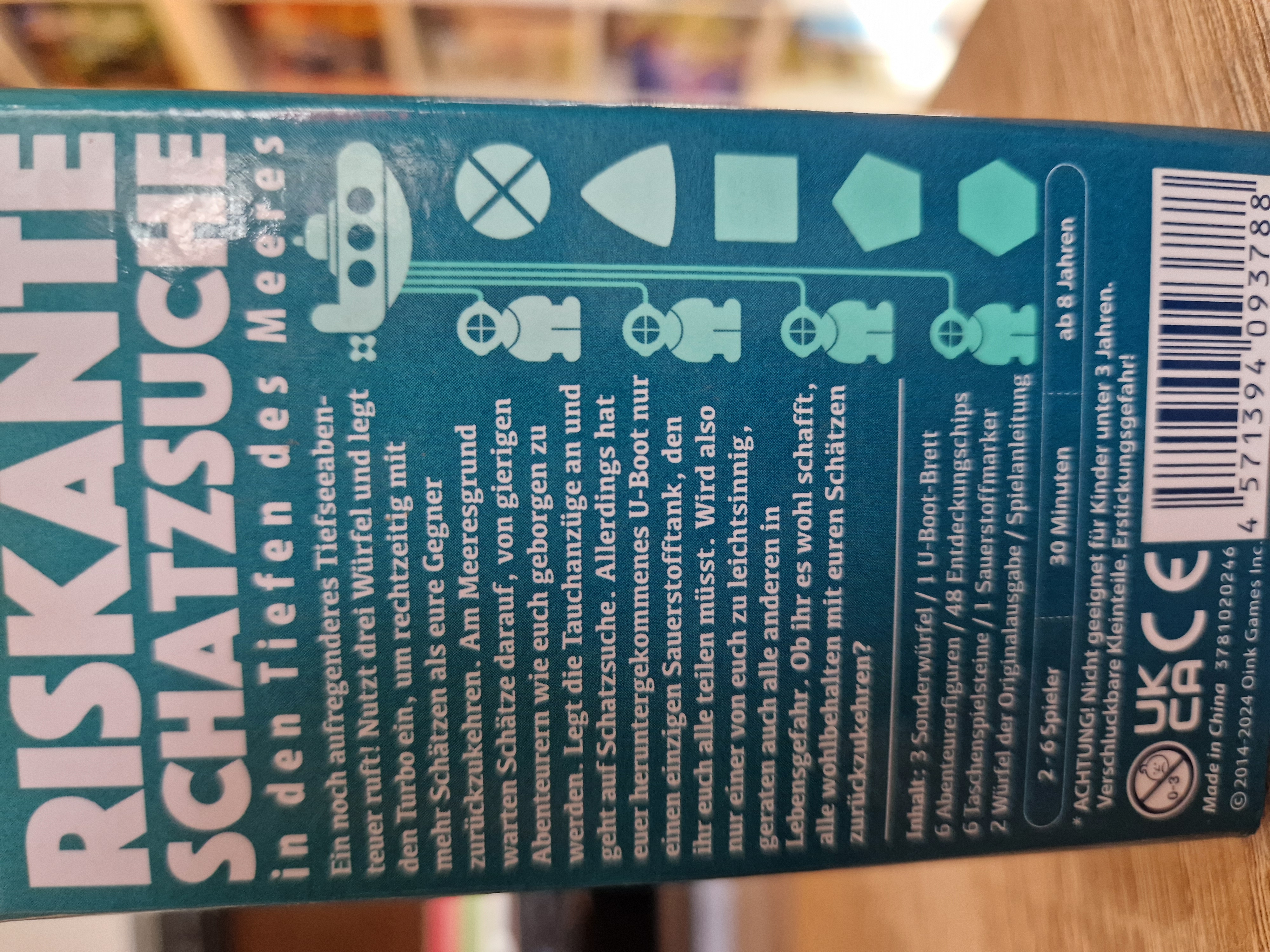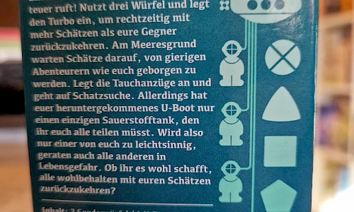 Ein noch aufregenderes Tiefseeabenteuer ruft! Nutzt die drei Würfel und legt den Turbo ein, um rechtzeitig mit mehr Schätzen als eure Gegner zurückzukehren. Am Meeresgrund warten Schätze darauf, von gierigen Abenteurern wie euch geborgen zu werden. Legt die Tauchanzüge an und geht auf Schatzsuche. Allerdings hat euer heruntergekommenes U-Boot nur einen einzigen Sauerstofftank, den ihr euch alle teilen müsst. Wird also nur einer von euch zu leichtsinnig, geraten auch alle anderen in Lebensgefahr. Ob ihr es wohl schafft, alle wohlbehalten mit euren Schätzen zurückzukehren?