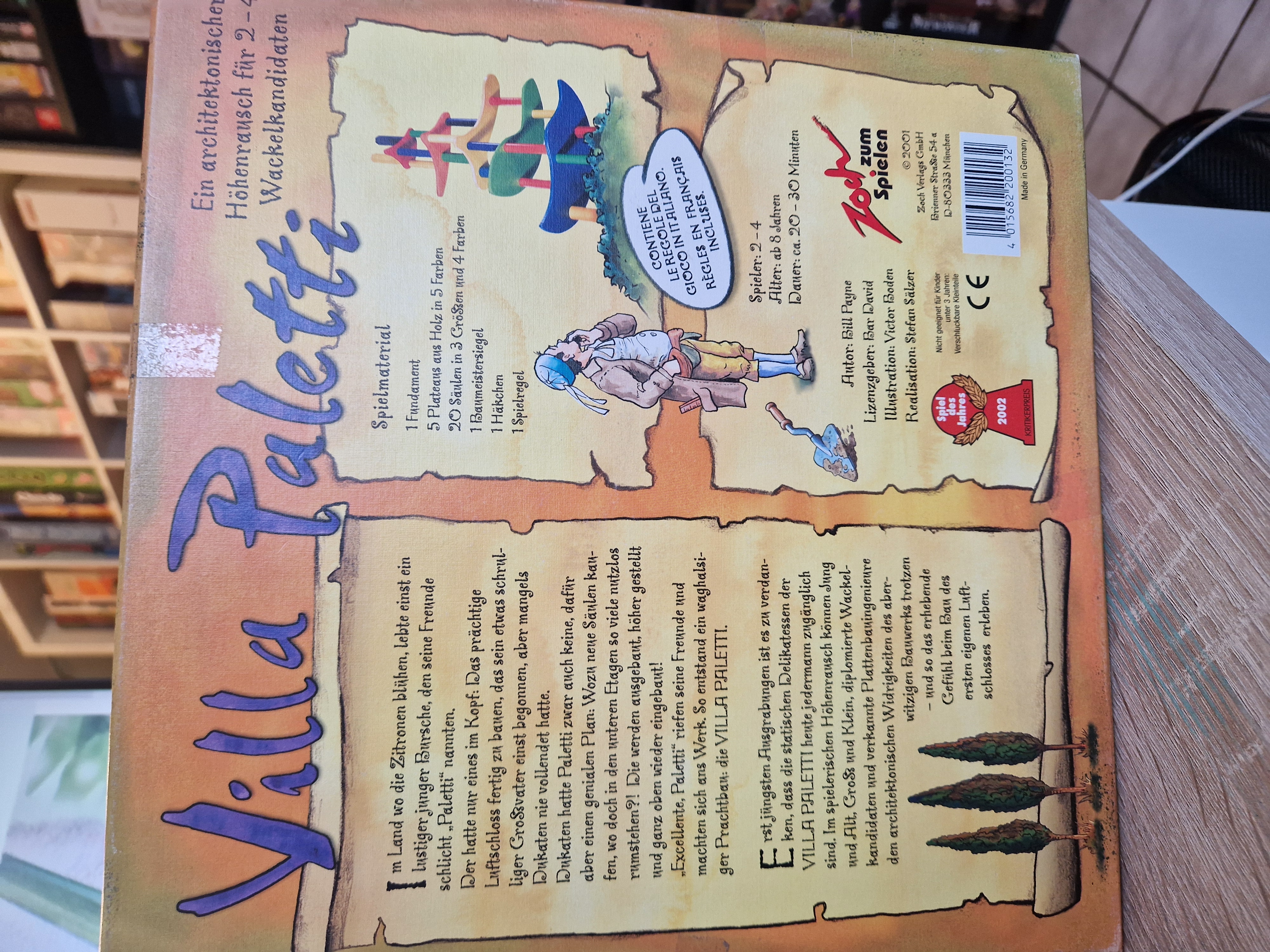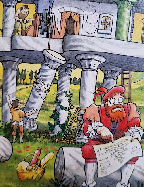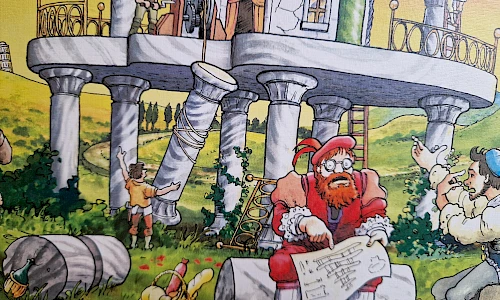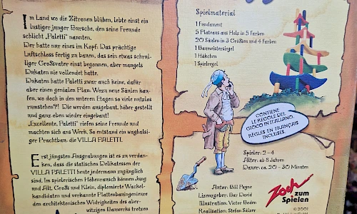 Im Land wo Zitronen blühen, lebte einst ein lustiger junger Bursche, den seine Freunde schlicht "Paletti" nannten. Der hatte nur eins im Kopft: das prächtige Luftschloss fertig zu bauen, das sein etwas schrulliger Großvater einst begonnen, aber mangels Dukaten nie vollendet hatte. Dukaten hatte Paletti zwar auch keine, dafür aber einen genialen Plan: Wazu neue Säulen kaufen, wo doch in den unteren Etagen so viele nutzlos rumstehen?! Die werden ausgebaut, höher gestellt und ganz oben wieder eingebaut" "Excellente, Paletti" riefen seine Freunde und machten sich ans Werk. So entstand ein waghalsiger Prachtbau: die Villa Paletti.
