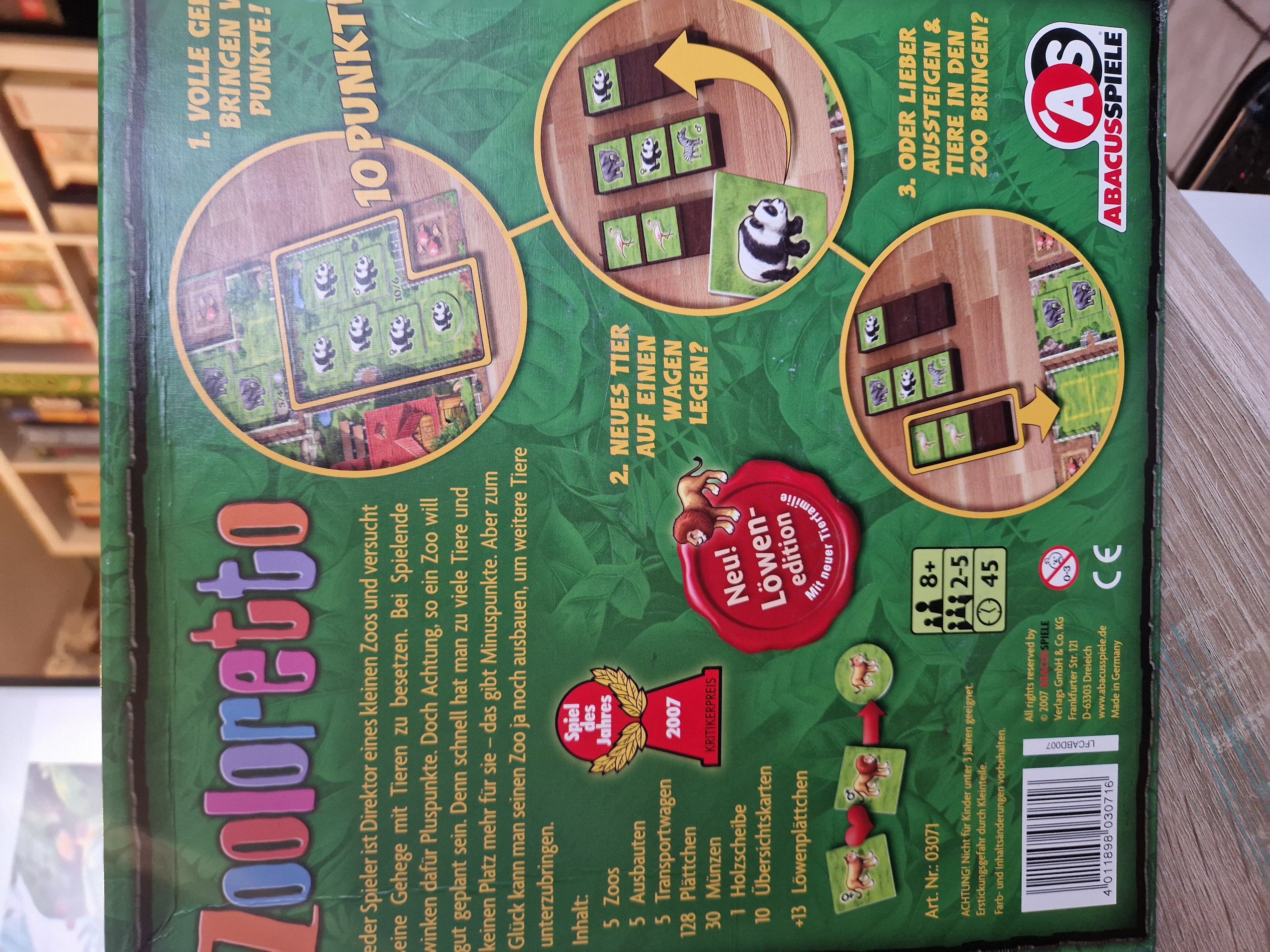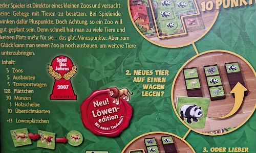 Jeder Spieler ist Direktor eines kleinen Zoos und versucht seine Gehege mit Tieren zu besetzen. Bei Spielende winken dafür Pluspunkte. Doch Achtung, so ein Zoo will gut geplant sein. Denn schnell hat masn zu viele Tiere und keinen Platz mehr für sie - das gibt Minuspunkte. Aber zum Glück kann man seinen Zoo ja noch ausbauen, um weitere Tiere unterzubringen