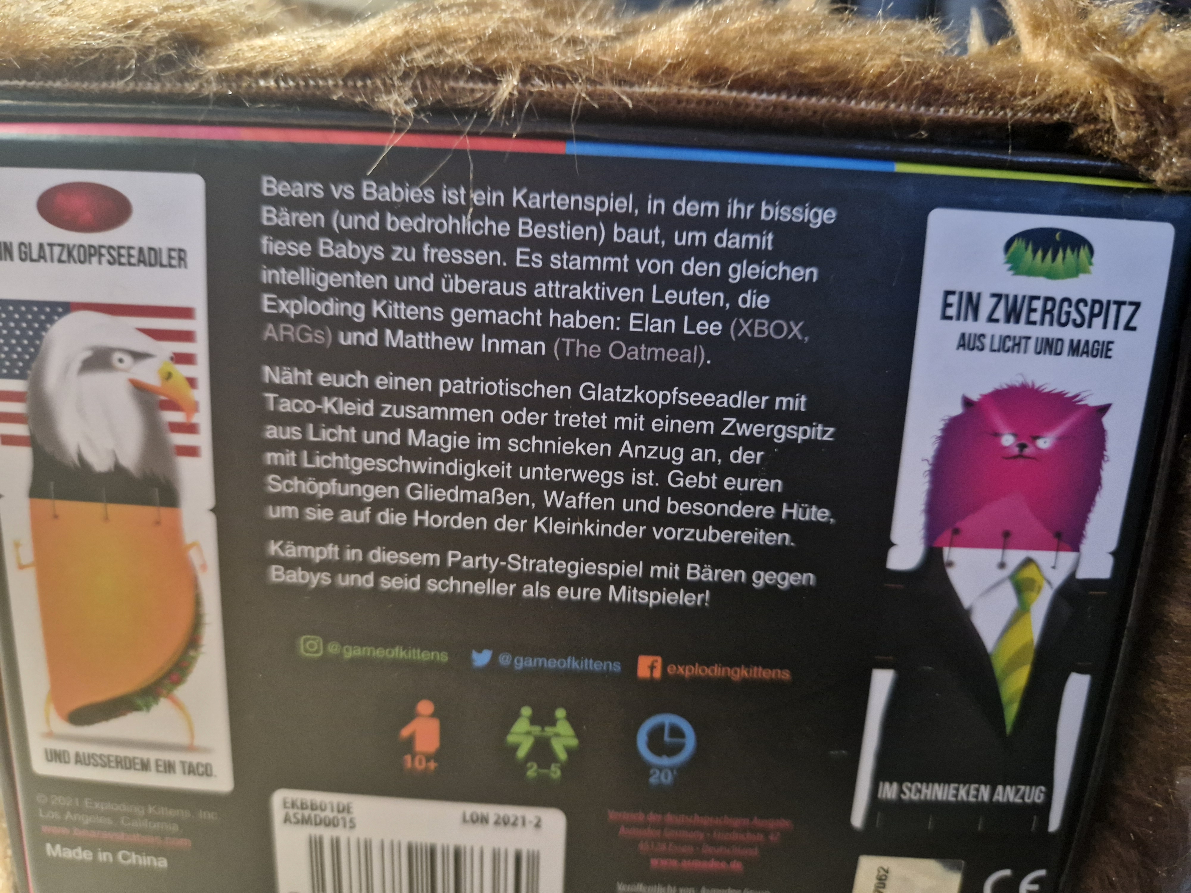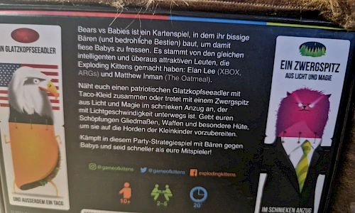 Bears vs. Babies ist ein Kartenspiel, bei dem ihr monströse Bären zusammenstellt (wie die Schachtel schon zeigt), um schreckliche Babys zu fressen – mnom mnom. Es wurde von denselben intelligenten und attraktiven Leuten erfunden, die euch auch schon Exploding Kittens gebracht haben.