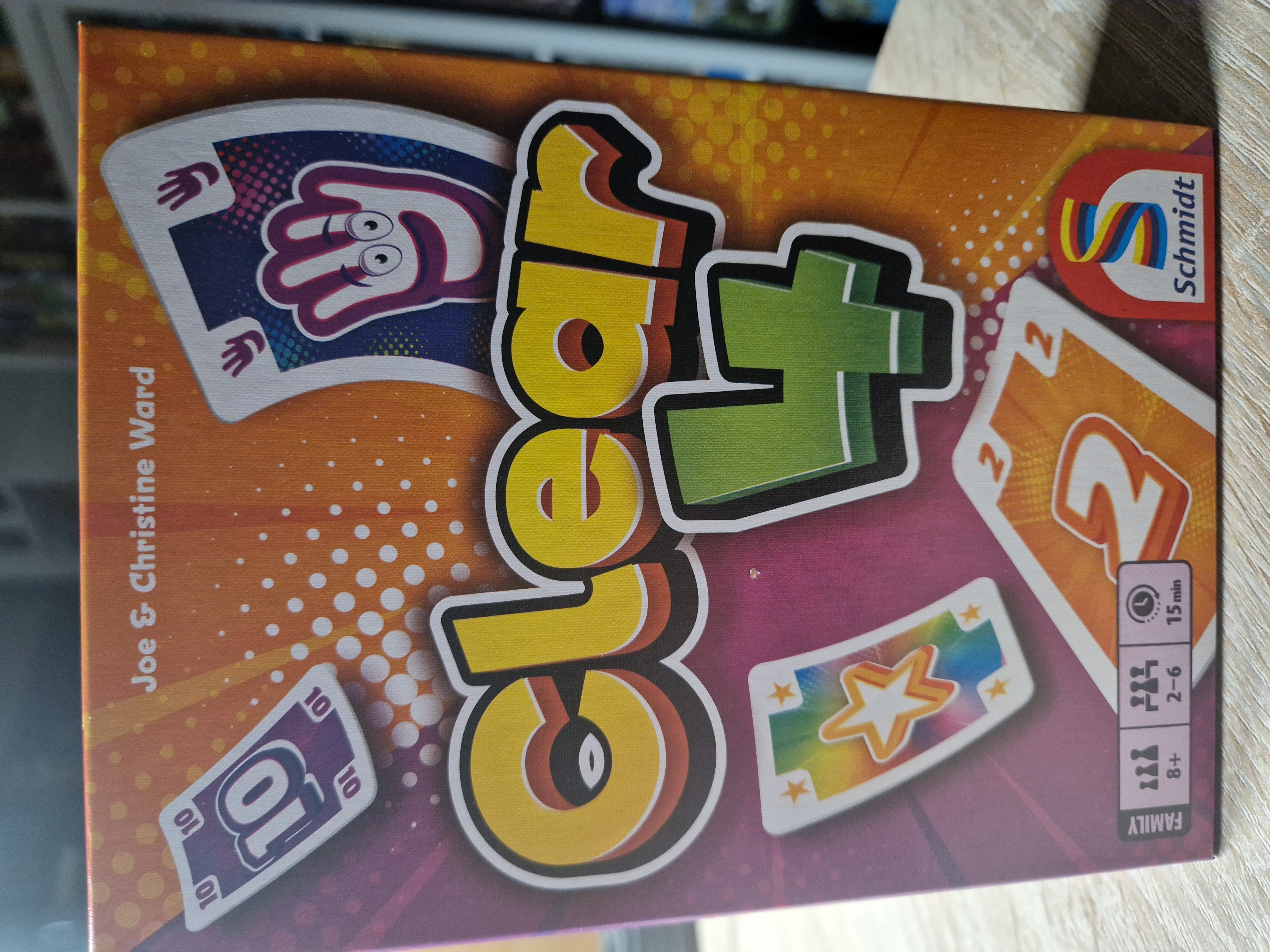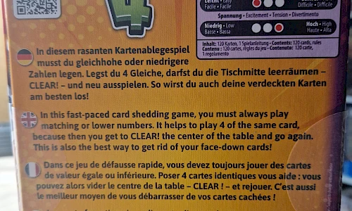 In diesem rasanten Kartenablegespiel musst du gleichhohe oder niedrigere Zahlen legen. Legst du 4 Gleiche, darfst du die Tischmitte leerräumen - CLEAR! - und neu ausspielen. So wirst du auch deine verdeckten Karten am besten los!