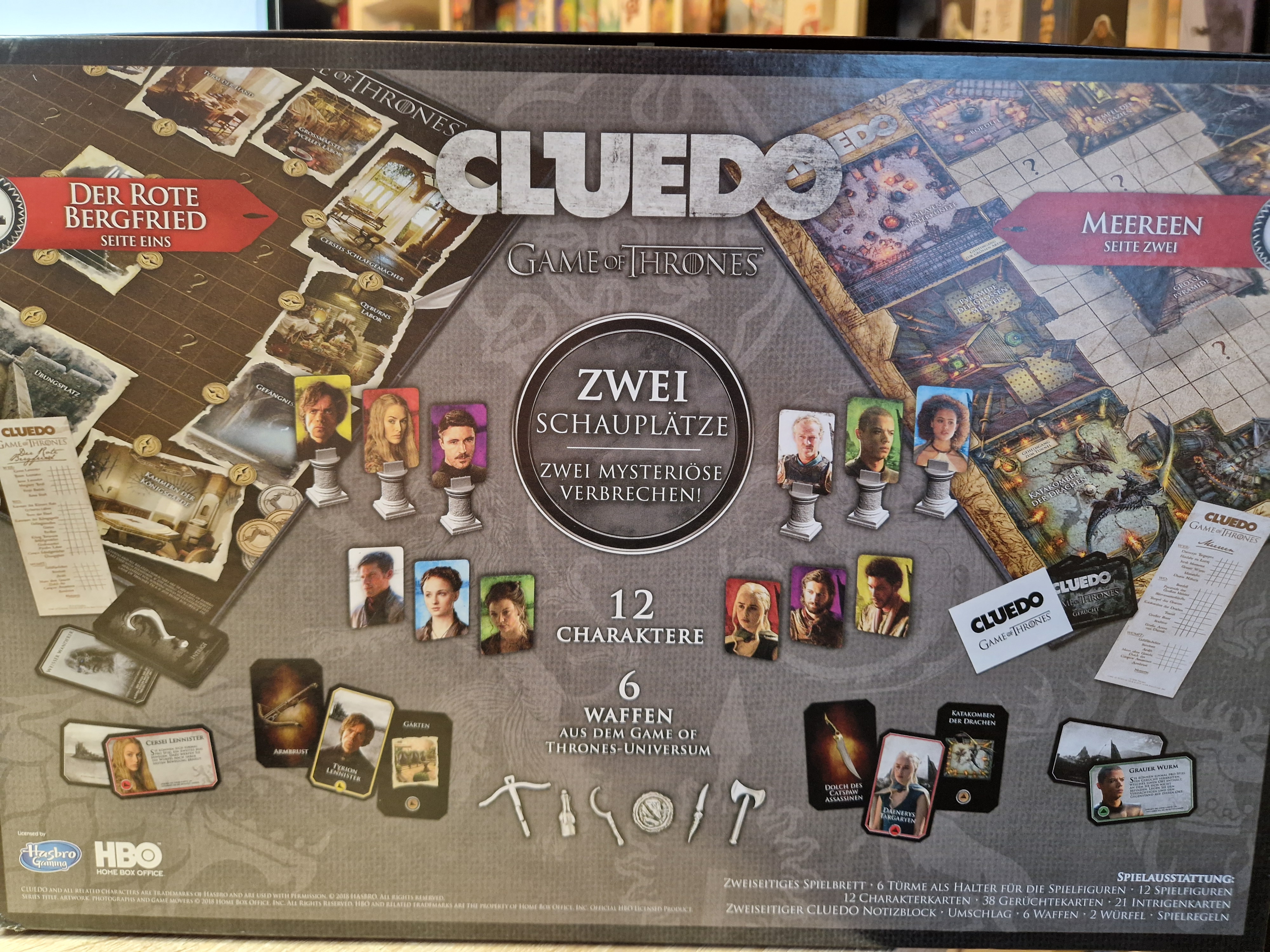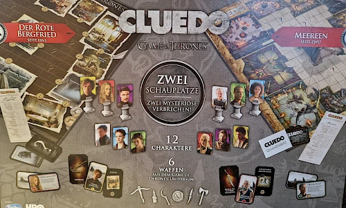 Dieses Spiel enthält zwei Geheimnisse, jedes mit eigenen Verdächtigen und Orten, verteilt auf die beiden Seiten des Spielbrettw - Meereen und der Rote Bergfried.