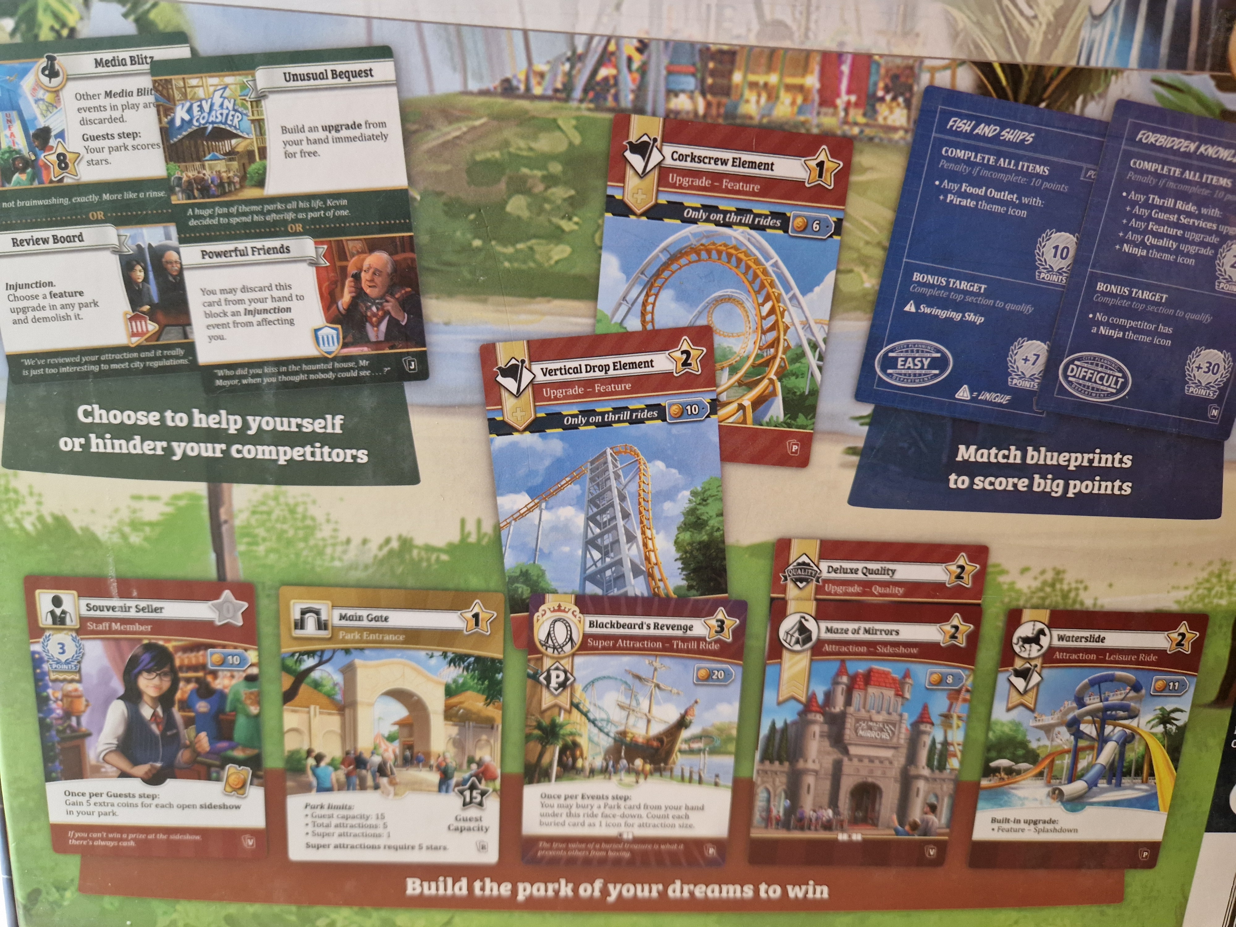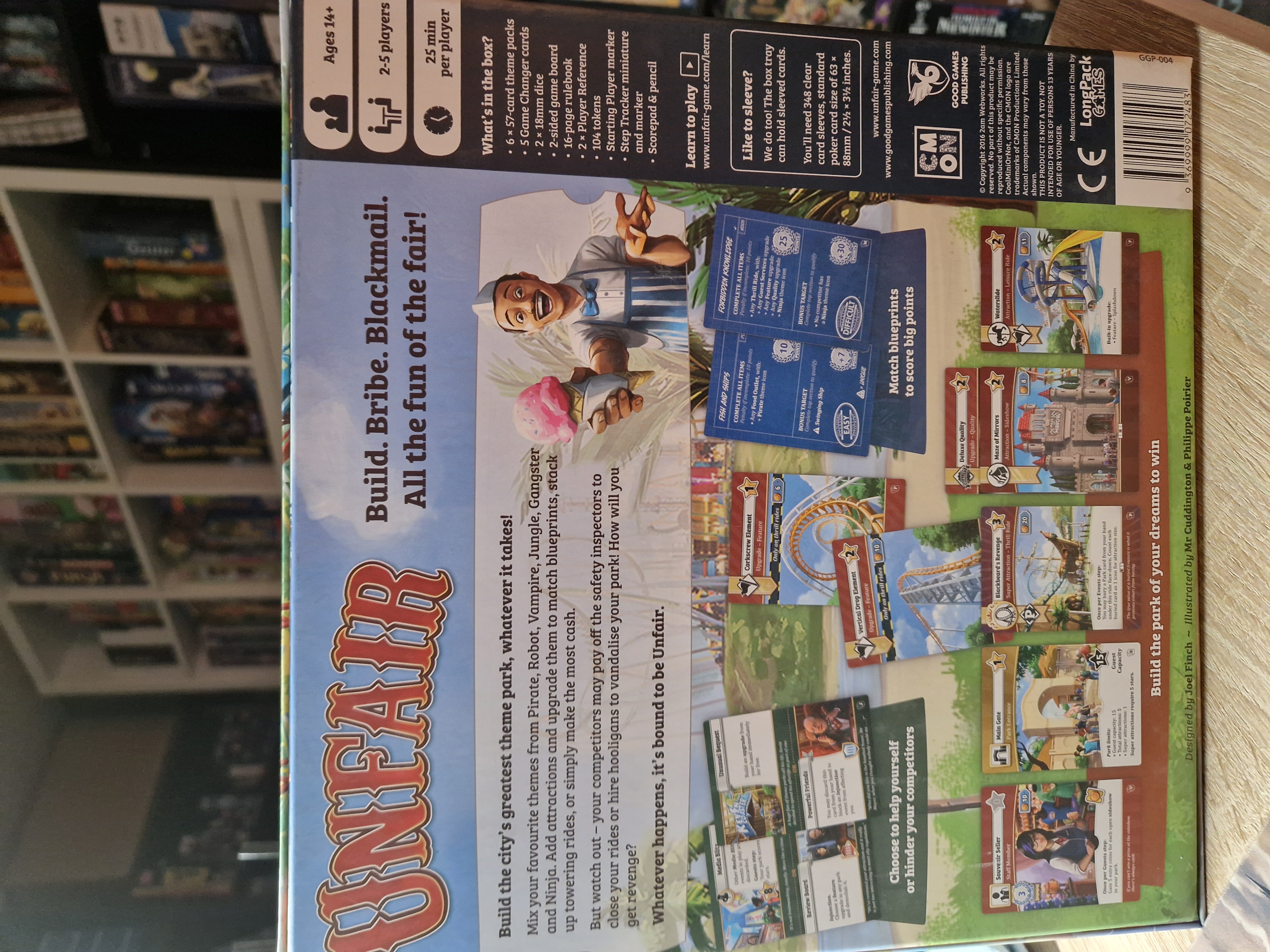 Unfair ist ein Freizeitpark-Aufbauspiel von Joel Finch für 2 bis 5 Personen, bei dem du beeindruckend hohe Attraktionen errichtest und aufwertest, geheime Ziele auf deinen Blaupausen verwirklichst und versuchst, das meiste Geld zu verdienen.