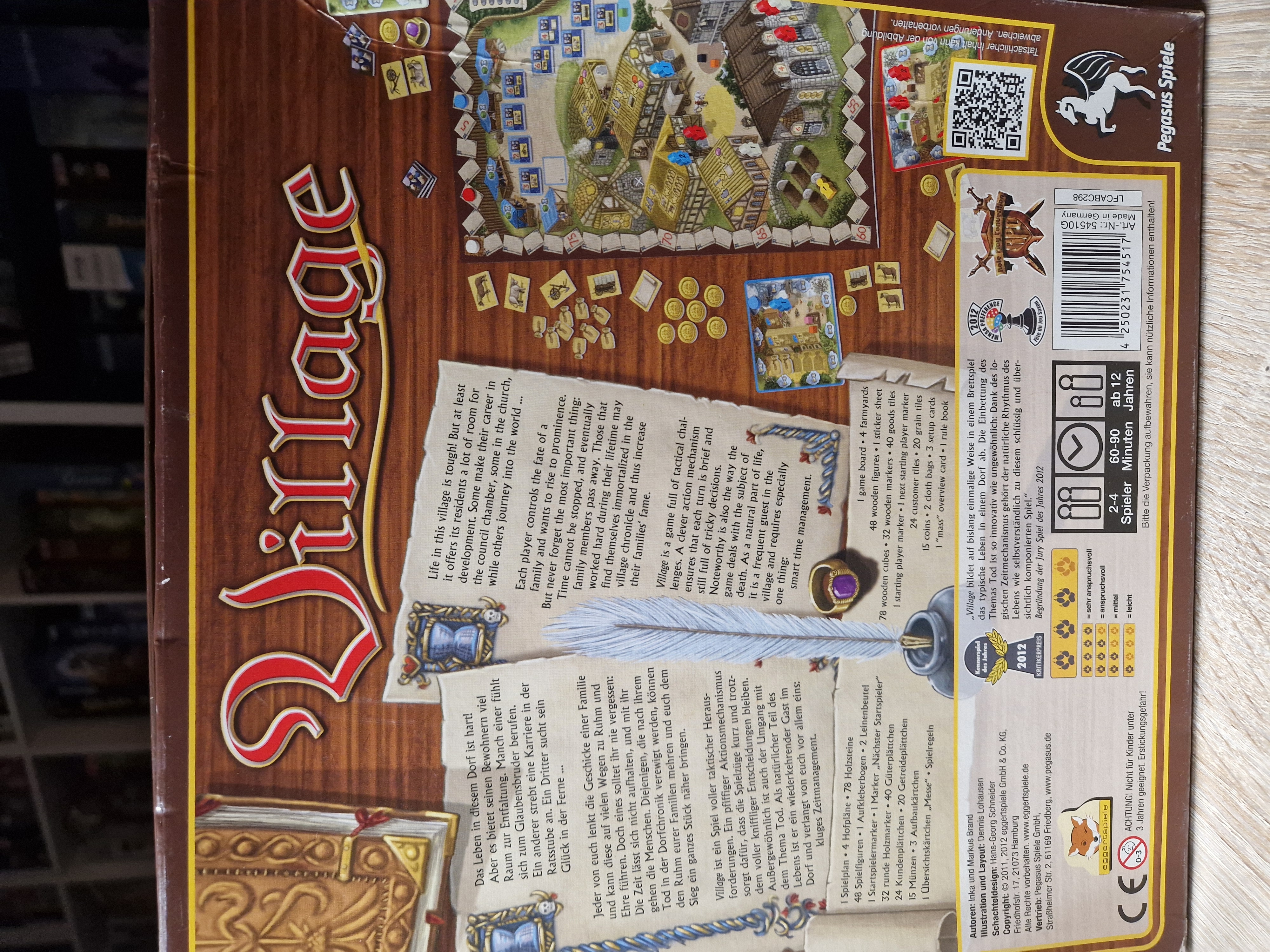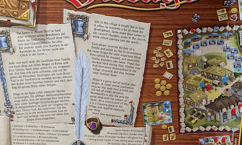 Village ist ein Spiel voller taktischer Herausforderungen. Ein priffiger Aktionsmechanismus sorgt dafür, dass die Spielzüge kurz und trotzdem voller kniffliger Entscheidungen bleiben. Außergewöhnlich ist auch der Umgang mit dem Thema Tod. Als natürlicher Teil des Lebens ist er ein wiederkehrender Gast im Dorf und verlangt von euch vor allem eins: kluges Zeitmanagement.