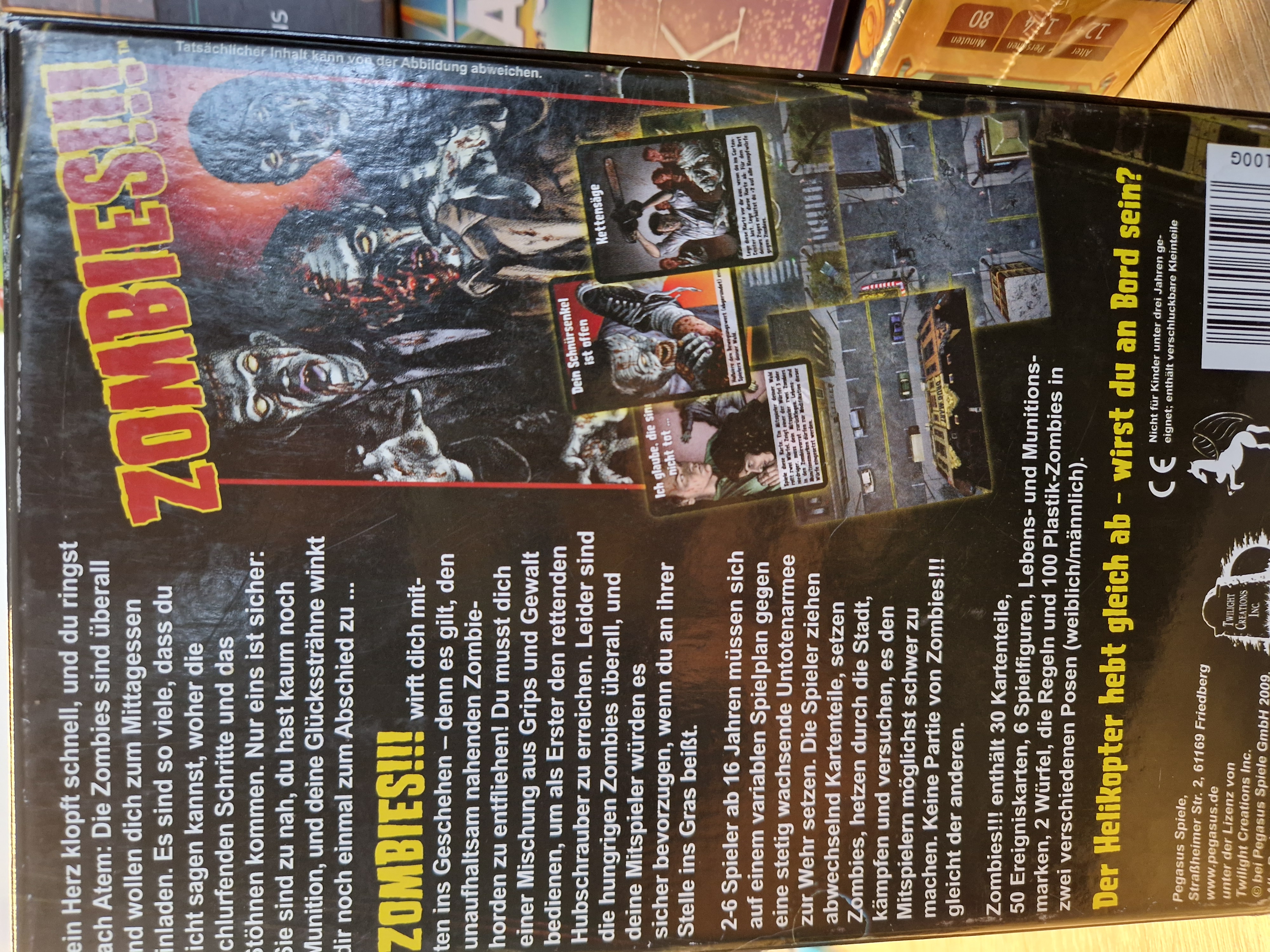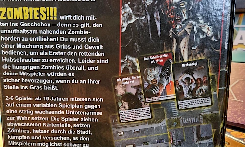 Zombies!!! wirft dich mitten ins Geschehen - denn es gilt, den unaufhaltsam nahenden Zombiehorden zu entfliehen! Du musst dich einer Mischung aus Grips und Gewalt bedienen, um als Erster den rettenden Hubschraubere zu erreichen. Leider sind die hungrigen Zombies überall, und deine Mitspieler würden es sicher bevorzugen, wenn du an ihrer Stelle ins Gras beißt.