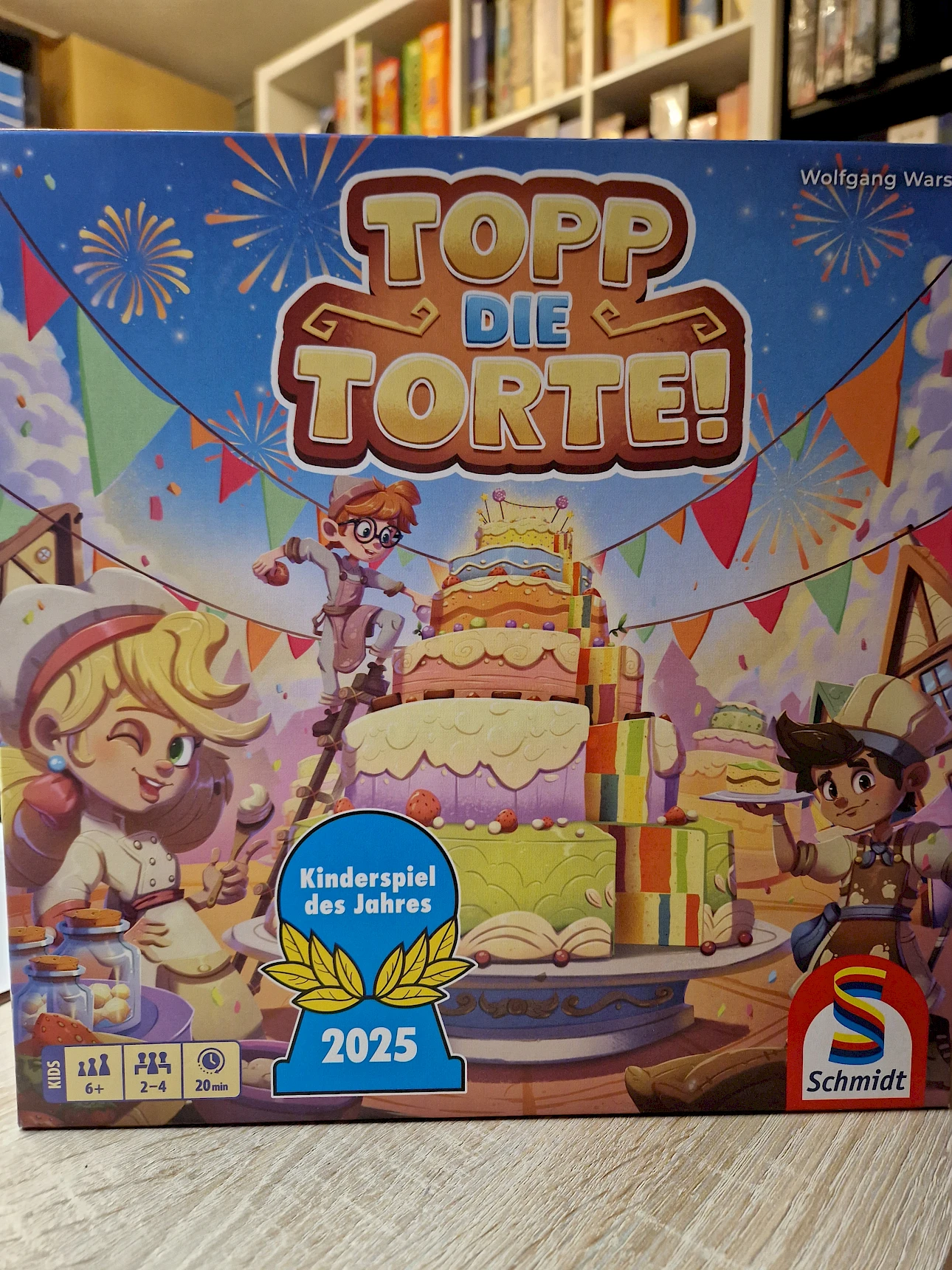 Zucker, Zimt und Augenmaß - Viel mehr braucht ihr nicht, um beim Torten-Toppen-Tunier zu bestehen. Schicht für Schicht baut ihr eure Torte aufeinander. Schaut genau, und wählt die farbigen Tortenböden passend aus. Für cleveres Anlegen gewinnt ihr Zuckerwürfel, die ihr gegen wertvolle Siegpunkte eintauschen könnt. Alle sind immer dabei, und Runde um Runde steigt die Spannung.
