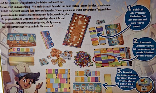 Zucker, Zimt und Augenmaß - Viel mehr braucht ihr nicht, um beim Torten-Toppen-Tunier zu bestehen. Schicht für Schicht baut ihr eure Torte aufeinander. Schaut genau, und wählt die farbigen Tortenböden passend aus. Für cleveres Anlegen gewinnt ihr Zuckerwürfel, die ihr gegen wertvolle Siegpunkte eintauschen könnt. Alle sind immer dabei, und Runde um Runde steigt die Spannung.