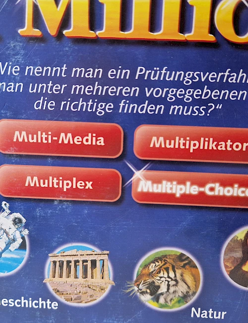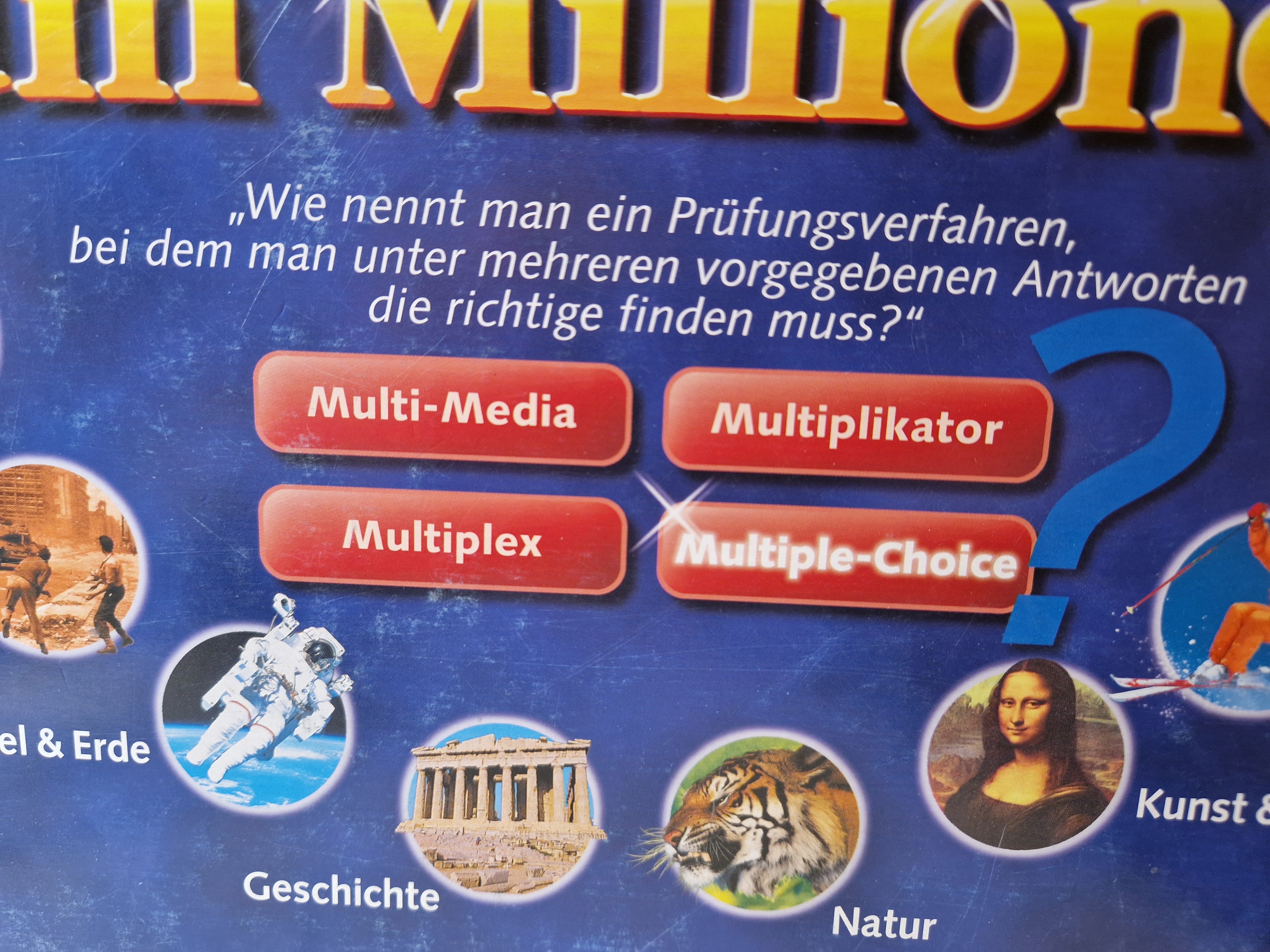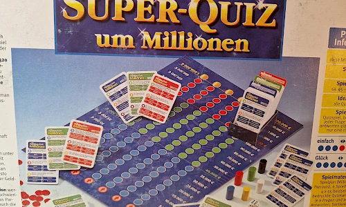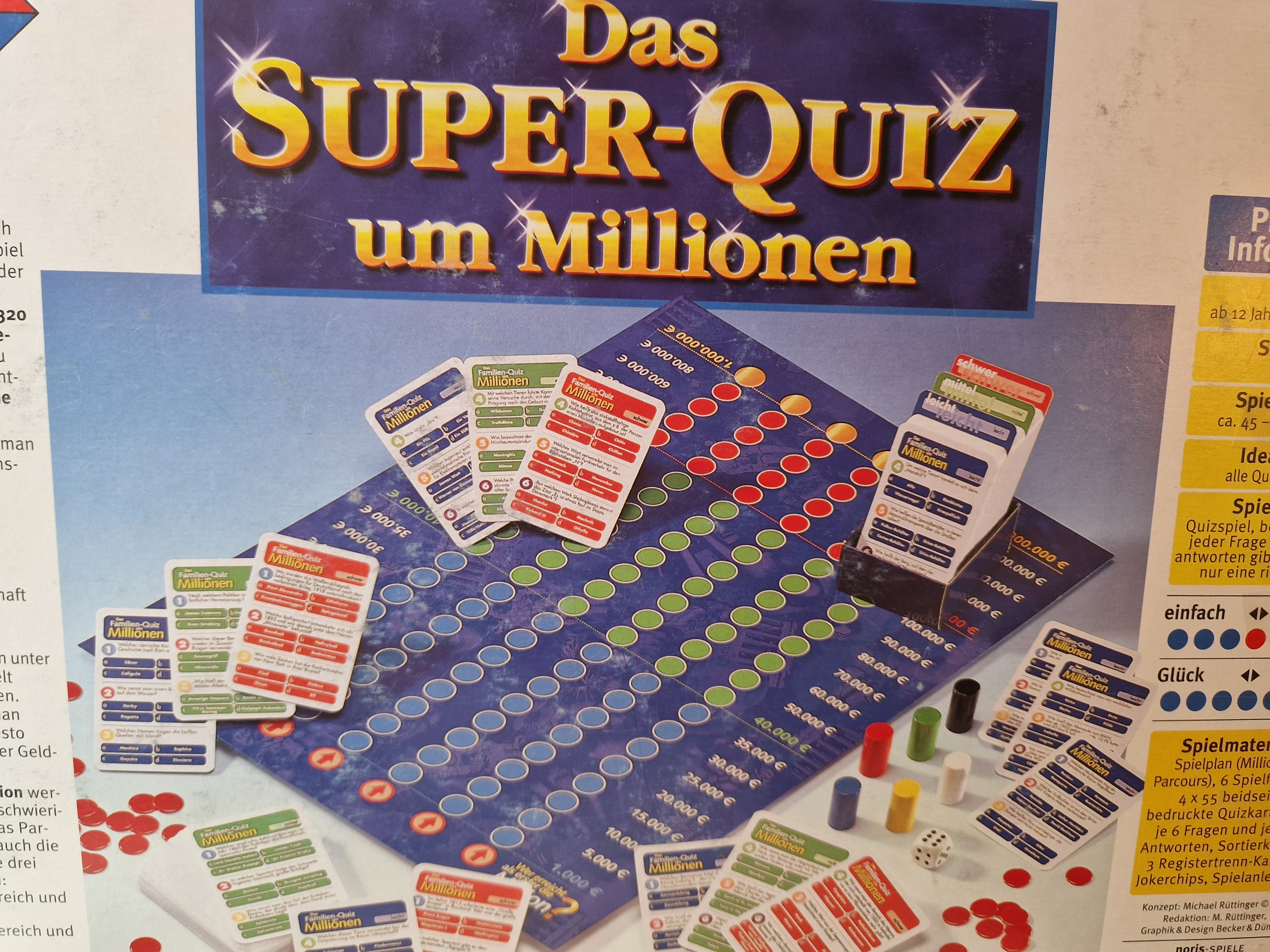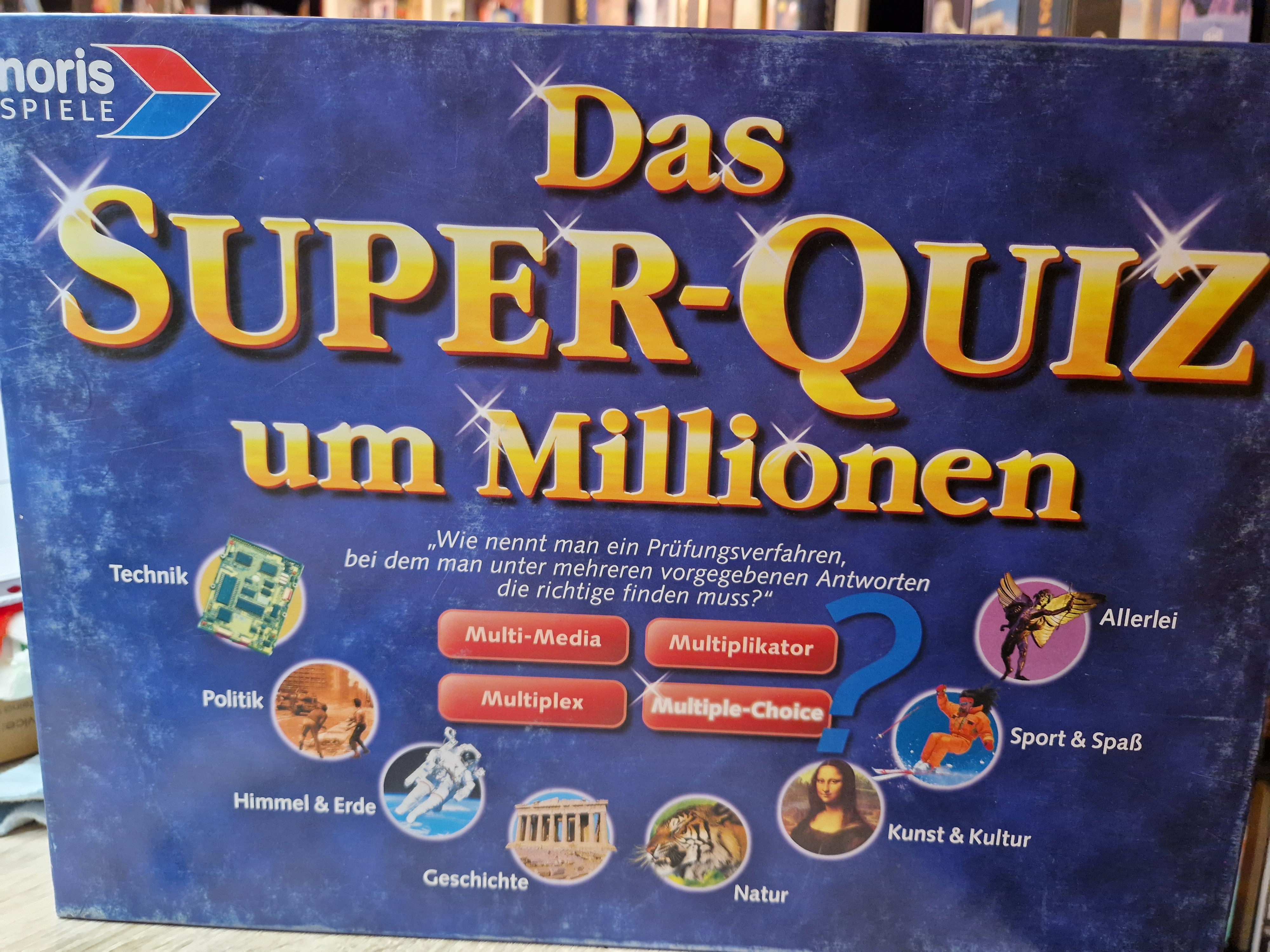 Diesen Traum kann man sich in diesem beliebten Quiz-Spiel erfüllen . ob allein oder in geselliger Runde. Dieses Superquiz enthält 1.320 Fragen und 5.250 Multiple-Choice-Antworten. Also zu jeder Frage vier Auswahlantworten, von denen nur eine richtig ist.