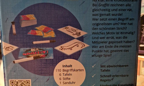 Na klar: eine Krokodilsträne! Bei Graffiti zeichnen alle gleichzeitig und einer rät, was gemalt wurde! Wer setzt einen Begriff am originellsten um? Wer hat den schönsten Strich? Welches Motiv ist einmalig? und wer errät, was die Mitspieler gepinselt haben? Wer am Ende die meisten Punkte hat, gewinnt das witzige Spiel!