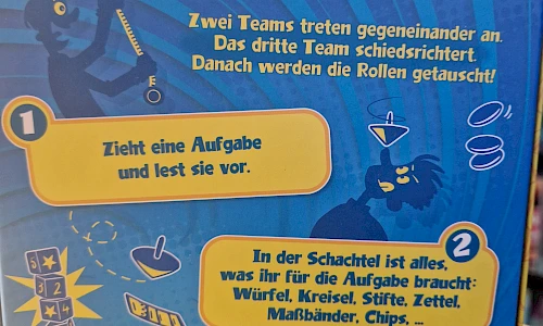 2. In der Schachtel ist alles, was ihr für die Aufgabe braucht: Würfel, Kreisel, Stifte, Zettel, Maßbänder, Chips, ...